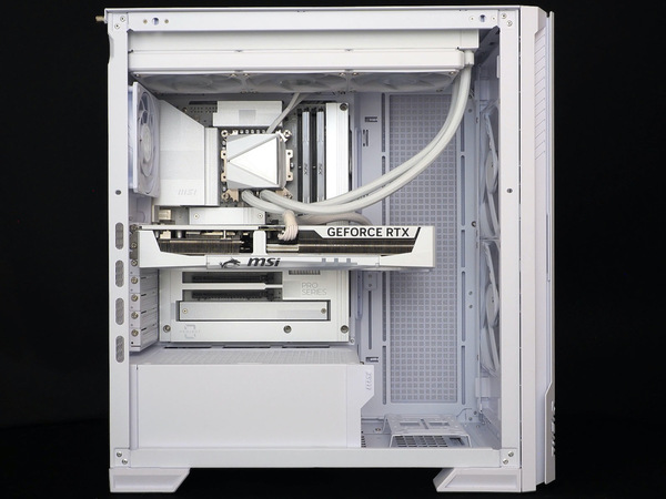 今回、よくあるCPUクーラーレビューのバラック状態とはせず、PCケース「MPG VELOX 300R AIRFLOW PZ / WHITE」と組み合わせている。マザーボードが背面コネクタ「Project Zero」モデルなのでベンチマーク台に載らなかったというのが理由だ。そのため、CPUクーラーの最大性能を測る(比較する)というよりは、実際に組み込んでの性能目安として見ていただきたい。なお、CPUの電力設定はPL1&PL2とも125Wの定格、MSI Center上ではAI Engineで「パフォーマンス」設定にしている。ほか計測時の室温は28℃、暗騒音は30dB以下だ。