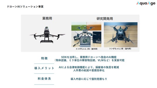 AquaAgeは、「業務用ドローン」と「業務特化型AI」の両方を提供することで、ドローンAIソリューション事業を展開しています。
