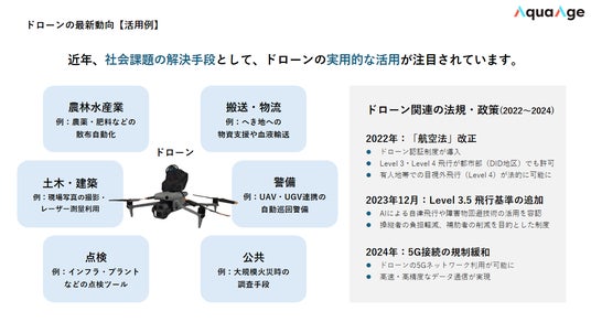 AquaAgeは、業務用ドローンと業務特化型AIを組み合わせたドローンAIソリューション事業を展開するとともに、次世代ドローンAIプラットフォーム「AIRPHA」を通じて、ドローン運用の自律化と業務効率化を一層推進していきます。