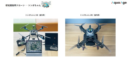 AquaAgeは、研究開発用途に向けたオリジナルドローン「トンボちゃん」シリーズ※1を独自開発し、ドローン用AI機能の実証を進めてきました。特に、AIとセンシング技術を融合した「トンボちゃん2号」は、ミリ単位の自律飛行と360°環境把握を実現する世界トップレベルのスマートドローンです。