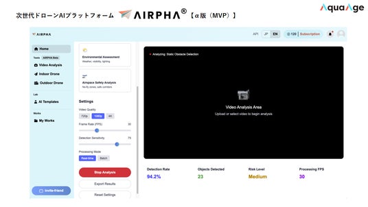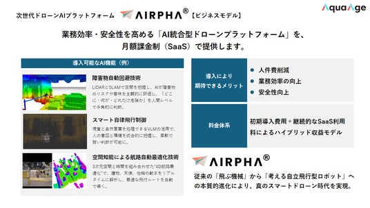 AquaAge株式会社(本社:名古屋市中村区、代表取締役:石 蔡峰、以下「AquaAge」)は、既存の業務用ドローンに業務特化型AI機能を付加し、より高度な物体認識・障害物回避・自律飛行を実現する次世代ドローンAIプラットフォーム「AIRPHA(エアファ)」のα版(MVP)を、2025年8月にリリースしたことをお知らせします。