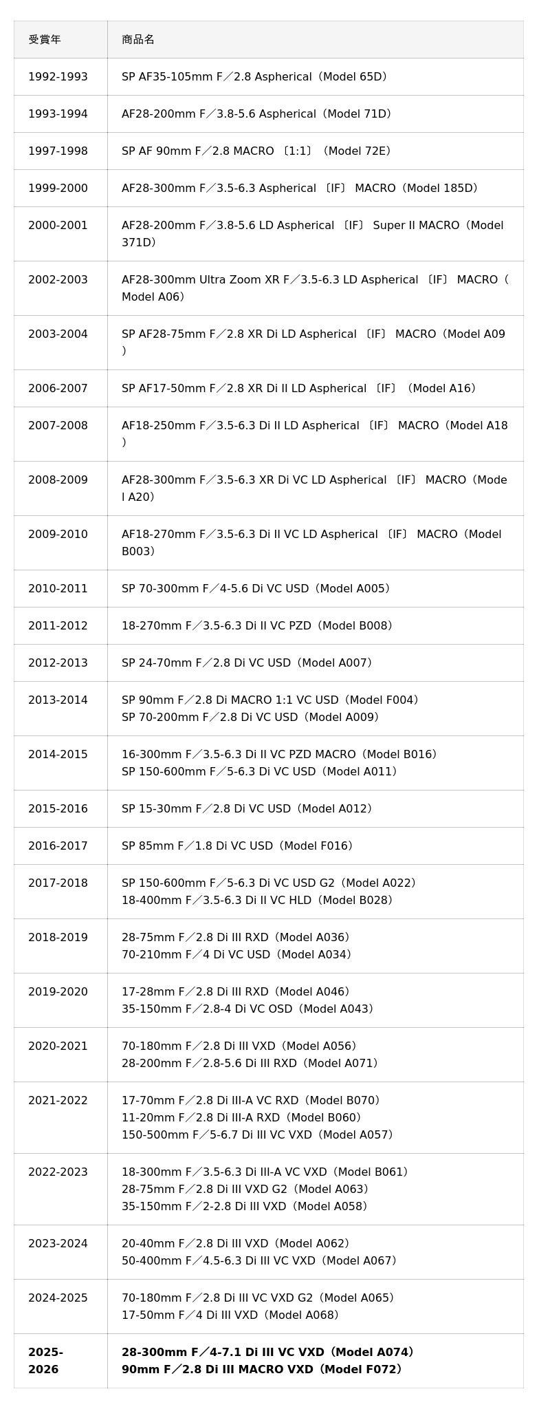 フルサイズミラーレス一眼カメラ対応のソニーEマウント用高倍率ズームレンズ28-300mm F/4-7.1 Di III VC VXD(Model A074)は「EISA SUPERZOOM LENS 2025-2026」、フルサイズミラーレス一眼カメラ対応のソニーEマウント用、ニコンZマウント用中望遠マクロレンズ90mm F/2.8 Di III MACRO VXD(Model F072)は「EISA MACRO LENS 2025-2026」をそれぞれ受賞しました。