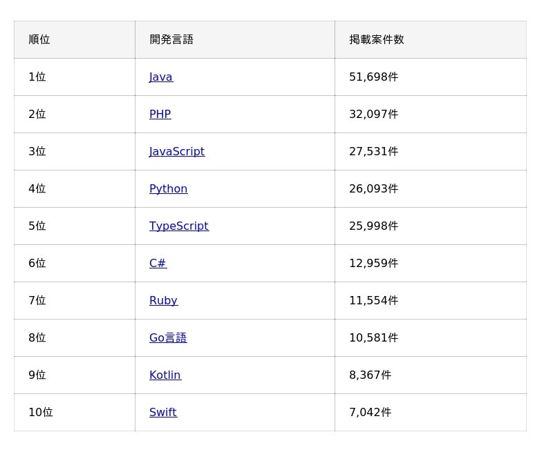 データ解析やAI分野で人気のPythonは4位(26,093件)、Web開発で注目のTypeScriptは5位(25,998件)と、上位はいずれも需要の高い言語となっています。