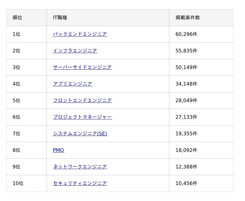 IT職種別の掲載案件数は1位がバックエンドエンジニア(60,296件)、2位がインフラエンジニア(55,835件)、3位がサーバーサイドエンジニア(50,149件)となっています。