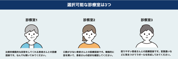 「OPQRST」には、47疾患の症例を搭載。また、1つの疾患に対して3タイプの「主訴(主な症状)」を用意。さらに、それぞれの主訴ごとに異なる性格の患者が「診察室1」「診察室2」「診察室3」に待機。Standardプランでは2つ、Proプランでは3つの診察室から選択可能。Proプランでは、1疾患につき最大9パターンの問診ができるため、合計で423人分の模擬患者との問診を体験できるという。