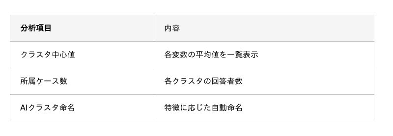 - 【直感的なセグメント理解】自動クラスタ命名: 「価格重視層」「品質重視層」など、特徴に応じた分かりやすいセグメント名をAIが自動生成