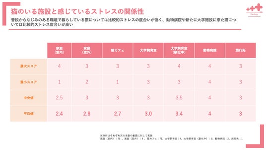 その結果、家庭内や猫カフェなど普段からなじみのある環境で暮らしている猫については比較的ストレスの度合いが低く、動物病院や新たに大学施設に来て馴化中の猫については比較的ストレス度合いが高いことが、動画の分析で判明しました。