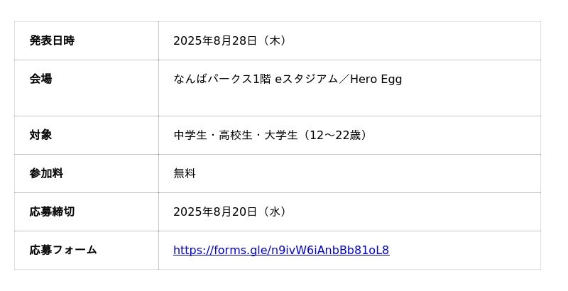 株式会社Meta Heroes(本社所在地:大阪府大阪市、代表取締役:松石和俊、以下「当社」)は、当社が運営するDX教育スペース「Hero Egg」と学生起業家として活躍する「EdFusion」代表、近藤にこるさんを「Hero Egg」学生プロデューサーに任命し、初代「Hero Eggアンバサダー」を決定するオーディションを2025年8月28日(木)に開催します。対象は12~22歳の中高生・大学生。上位入賞者には大阪・関西万博「こども万博」内での運営体験や、Hero Eggを活用したイベント企画など、リアルな活動機会が授与されます。応募締切は8月20日(水)、参加費は無料です。