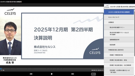 セルシスは、8月8日(金)開示の決算短信・補足資料をもとに制作した「2025年12月期 第2四半期 決算説明動画」を8月19日(火)に公開しました。この動画では、代表取締役が自ら決算概況、中期経営計画と進捗状況、分野別の概況について説明しており、より深く会社の現状や今後の戦略を理解していただける内容となっています。