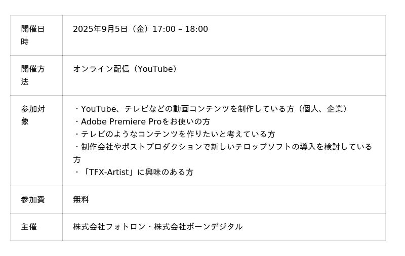 株式会社ボーンデジタル(本社:東京都千代田区、代表取締役:新 和也、URL:https://www.borndigital.co.jp)は、株式会社フォトロンと共同で、オンラインセミナー「動画を劇的に進化させよう!テレビから学ぶ、魅せるテロップ演出テクニック!」を2025年9月5日(金)に開催いたします。