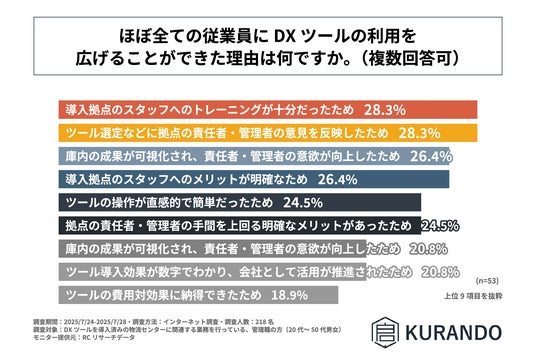 調査の最後、DXツールをほぼ全ての従業員が利用していると回答した人を対象に「ほぼ全ての従業員にDXツールの利用を広げることができた理由」を尋ねる設問への回答では、1位が同率で「導入拠点のスタッフへのトレーニングが十分だったため」、「ツール選定などに拠点の責任者・管理者の意見を反映したため」で28.3%、3位も同率で「庫内の成果が可視化され、責任者・管理者の意欲が向上したため」、「導入拠点のスタッフへのメリットが明確なため」で26.4%という結果になりました。この結果から、DXツールがほぼ全ての従業員に利用されている物流センターに関わる管理職の方が考える、ほぼ全ての従業員にDXツールの利用を広げることができた主な理由は「庫内の成果が可視化され、導入拠点のスタッフの意欲が向上したため」や「ツール選定などに拠点の責任者・管理者の意見を反映したため」であることが明らかになりました。