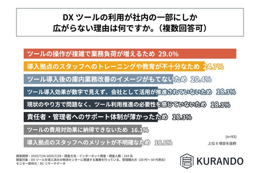 次に、DXツールが社内の一部でしか利用されていない、またはほとんど利用されていないと回答した人を対象に「DXツールの利用が社内の一部にしか広がらない理由」を尋ねる設問への回答では、1位が「ツールの操作が複雑で業務負荷が増えるため」で29.0%、2位が「導入拠点のスタッフへのトレーニングや教育が不十分なため」で24.7%、3位が「ツール導入後の庫内業務改善のイメージがもてないため」で20.4%という結果になりました。この結果から、DXツールが社内の一部でしか利用されていない物流センターに関わる管理職の方が考える、DXツールの利用が社内の一部にしか広がらない理由、1位は「ツールの操作が複雑で業務負荷が増えるため」であることがわかりました。