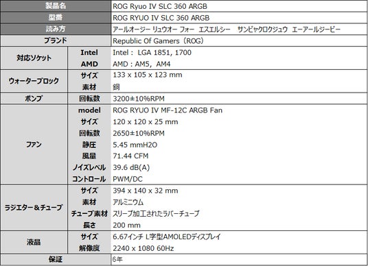 ASUS JAPAN株式会社は、ゲーミングブランドのRepublic of Gamersより、大型6.67インチL字型のAMOLEDディスプレイ搭載、中央配置のチューブレイアウトを採用したCPU用水冷クーラー「ROG RYUO IV SLC 360 ARGB」を発表しました。2025年8月22日(金)より発売開始します。