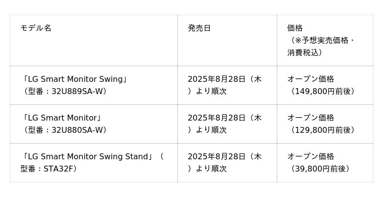 モニター+ホイール付き可動式フレキシブルスタンドの「LG Smart Monitor Swing」(型番:32U889SA-W)、モニター+HASスタンドの「LG Smart Monitor」(型番:32U880SA-W)、そして、ホイール付き可動式フレキシブルスタンドの「LG Smart Monitor Swing Stand」(型番:STA32F)の計3モデルをラインナップしており、ライフスタイルに合わせてお選びいただけます。なお、「LG Smart Monitor Swing」(型番:32U889SA-W)は販売店限定モデルとなります。