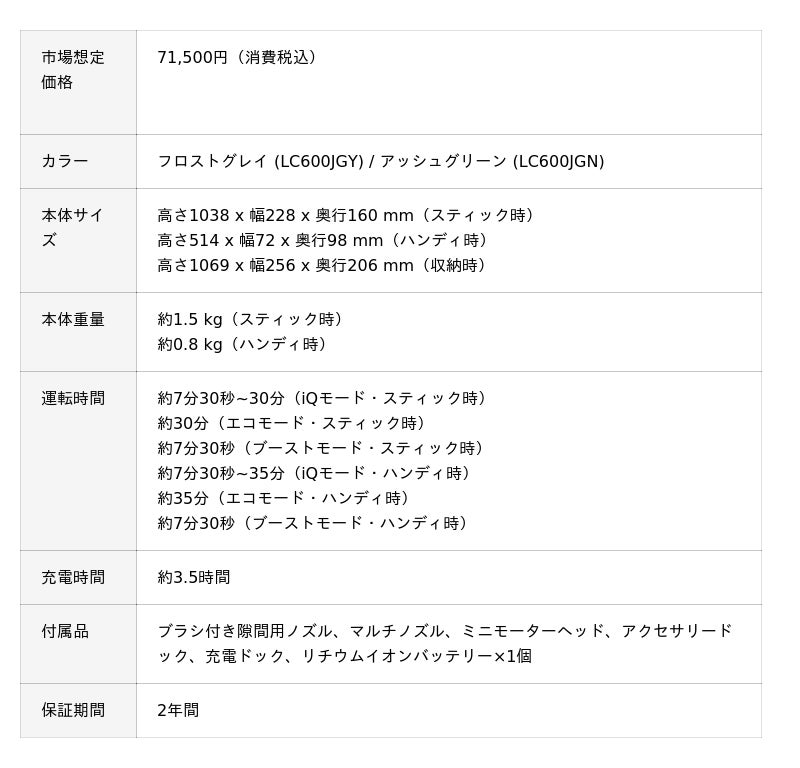 ※2 LC200JIV。IEC 62885-4に則り、自社専門施設によるフローリングとカーペットでの測定結果に基づく。家電量販店の販売台数実績(2022年7月から2023年6月まで)の上位85%の本体重量1.5kg以下の製品と比較。当社調べ。