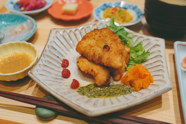 魚やお肉などの選べる主菜から、この日は「鶏肉の塩麹唐揚げ~しそジェノベーゼソースで~」をチョイスしました。衣はサクッと香ばしく、塩麹に漬け込んだ鶏肉はしっとり柔らか。大葉の香りが爽やかなジェノベーゼソースと甘酸っぱい梅ソースが唐揚げの旨みを引き立ててくれます。あっという間に一杯目のご飯も完食です。