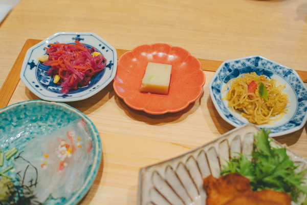 定食には、豆皿3種やご飯のお供、さらに真鯛の薄造り(薬味と出汁付き)にお味噌汁まで揃います。一口一口違う組み合わせでご飯を楽しめるので、次はどれにしよう?と選びながら食べる時間も楽しい!