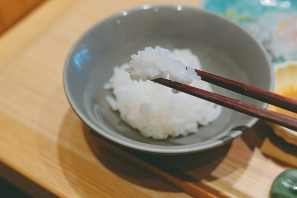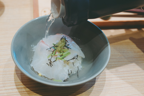 3杯目はもちもちに炊き分けられた白米をいただきます。水分量は同じなのにもっちりとした食感があり、同じお米でも炊き方だけでこんなに味わいが変わるのかと感動! お米の味を楽しんだところで、真鯛の薄造りを数切れのせ、熱々の出汁を注いで即席鯛茶漬けに。さっぱりとした鯛と旨みのある出汁がご飯に染みわたり、ほっとする美味しさでした。