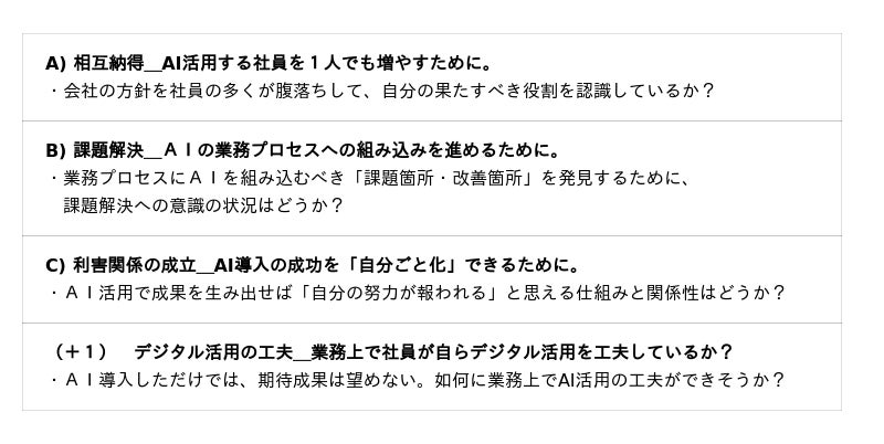 『組織の土台』をまず把握して改善を支援、そして、AIスキル習得だけではなく、