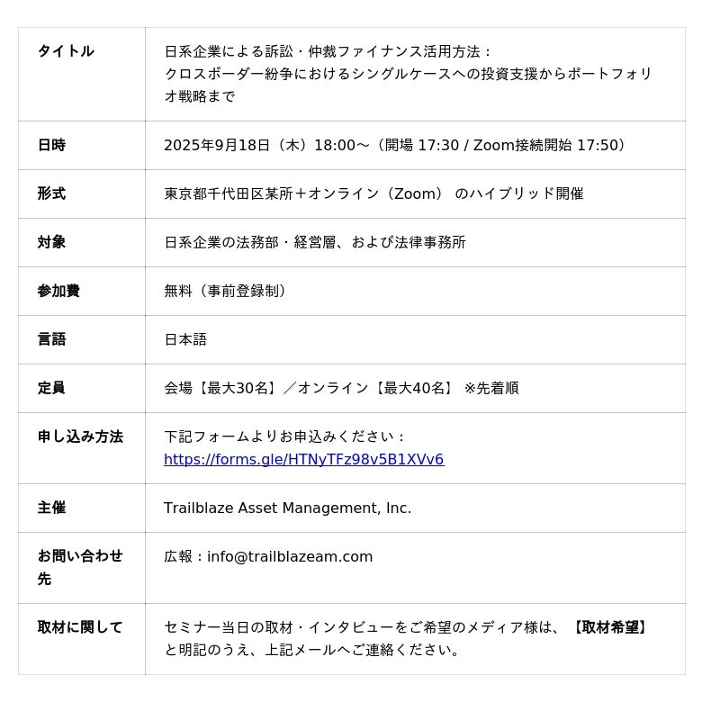 Trailblaze Asset Managementは、日系企業の法務部・経営層および法律事務所を対象に、「国際訴訟・仲裁における訴訟・仲裁ファイナンスの実務活用」を解説するセミナーを開催します。
