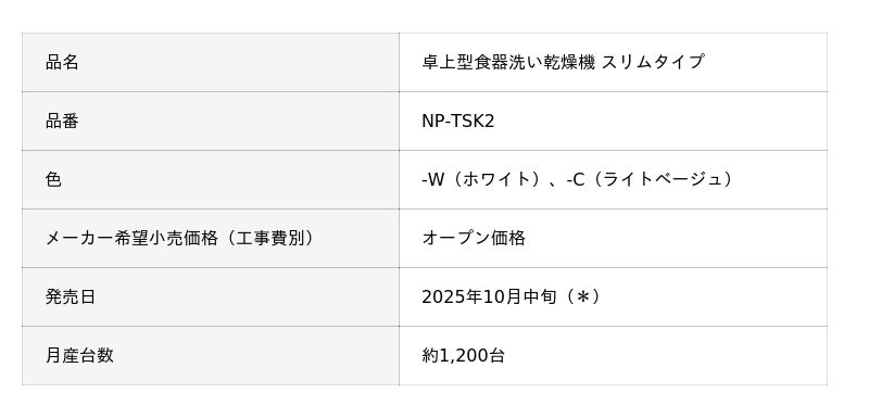 ▼[プレスリリース]卓上型食器洗い乾燥機 スリムタイプ NP-TSK2を発売(2025年8月21日)