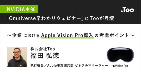 クリエイティブ市場の総合商社・株式会社Too(本社/東京都港区虎ノ門3-4-7、社長/石井剛太、以下Too)は、2025年8月29日(金)14:00~15:10にてNVIDIAが主催するウェビナー「Omniverse早わかりウェビナー 第5回 空間コンピューティングとデジタルツイン 実践編」に、当社執行役員、Apple事業開発部 ゼネラルマネージャーの福田が登壇することをお知らせします。