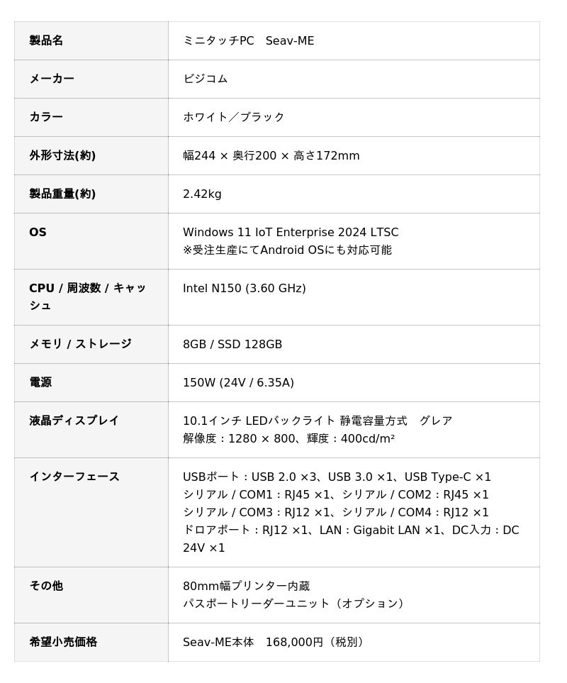 株式会社ビジコム(本社:東京都新宿区、代表取締役:中馬 浩)は、10.1インチのミニタッチPC『Seav-ME』を2025年秋に発売いたします。幅わずか244mm、奥行200mmのコンパクトな筐体に、高性能なIntel N150プロセッサーと内蔵プリンターを搭載。さらに、企業向けに最適化されたWindows 11が安定した動作を支え、限られたカウンタースペースでも、多機能かつスマートな運用を可能にします。免税にも1台で対応できるPOSレジ端末や、セルフチェックイン機、発券機など幅広いシーンで活躍する次世代の業務用端末です。