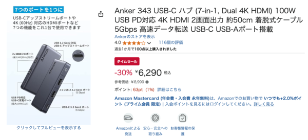 Amazonタイムセールにて「Anker 343 USB-C ハブ (7-in-1, Dual 4K HDMI)」を販売中です。