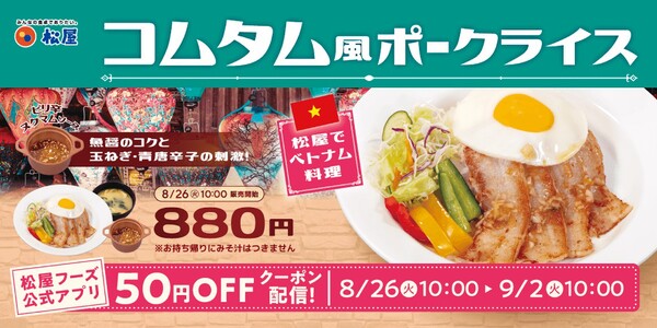 牛めしを提供する「松屋」は8月26日10時から、新商品「コムタム風ポークライス」を発売します。