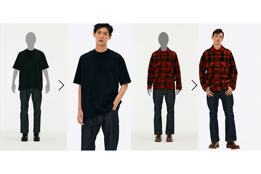 第一弾として、三越伊勢丹ECサイト「三越伊勢丹オンラインストア」で社内外への撮影サービスを運営するイセタンスタジオと連携し、「JUNYA WATANABE MAN」のEC販売でAIモデルとAIささげ動画生成サービスの提供を開始するという。