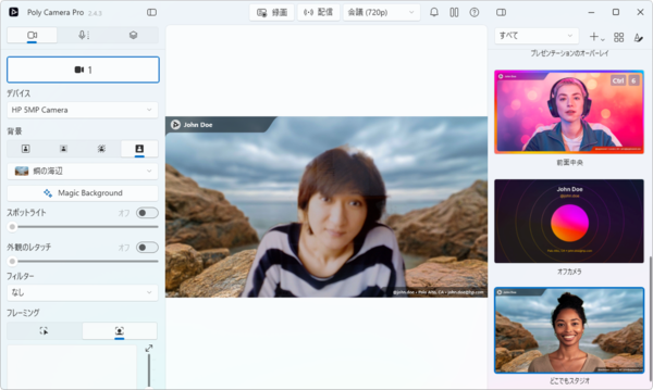 「HP EliteBook 8 G1a 13」の真価が発揮されるのは、「コラボレーション機能」だろう。まず注目したいは、「Poly Camera Pro」の採用だ。これは、AI搭載のスタジオエフェクトにより、背景のぼかしや置換、オーバーレイ表示、オートフレーミング機能など、プロレベルの映像加工をリアルタイムで適用できるというもの。リモート会議での映像品質が劇的に向上するのがメリットだ。