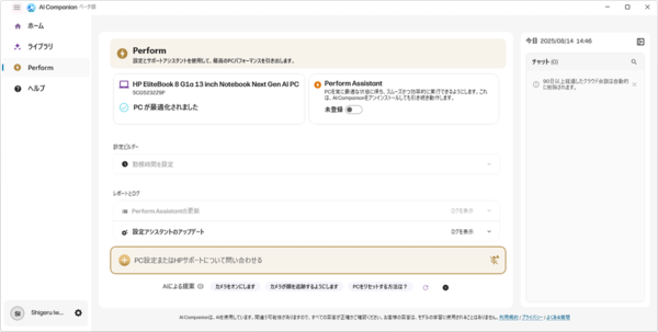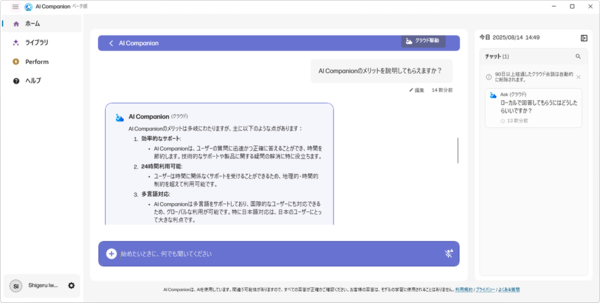 次に注目したいのは、HP独自の「HP AI Companion」機能。これは、一般的な生成AIサービスに近い対話能力を、オフライン環境でも実現するAIアプリだ。