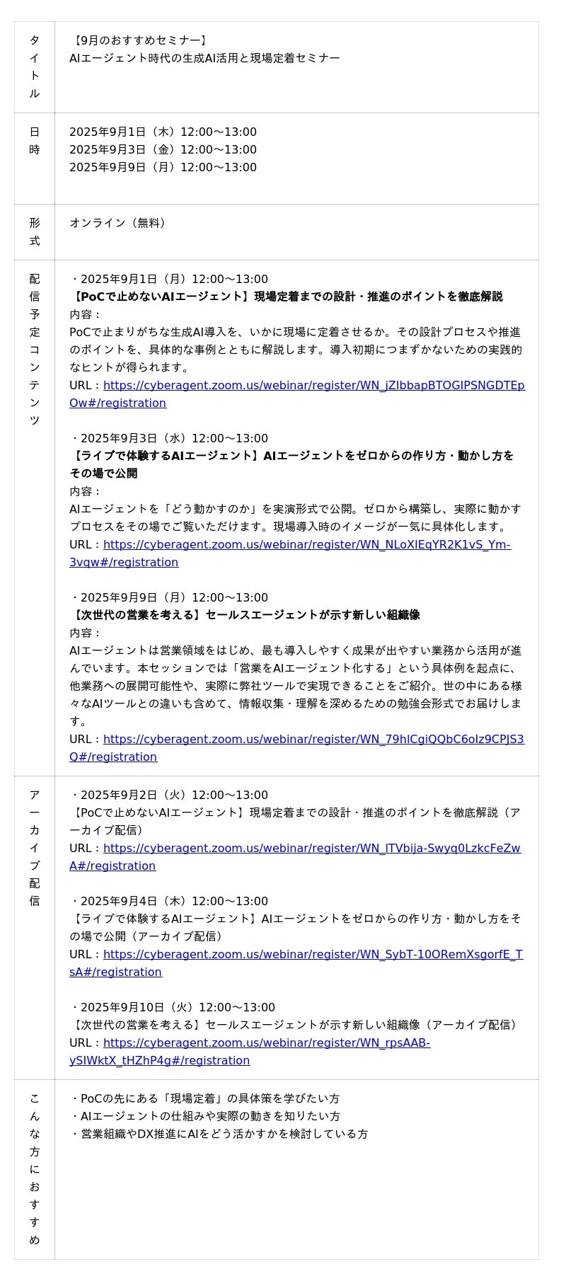AIエージェントありきで考える業務フローの再設計やAIエージェントの構築プロセス、さらには営業組織における活用のヒントまで、幅広いテーマでお届けします。