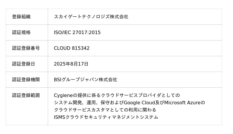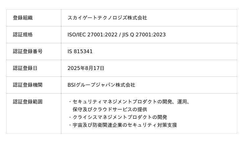 スカイゲートテクノロジズ株式会社(本社:東京都渋谷区、代表取締役:粟津 昂規、以下「スカイゲートテクノロジズ」)は、情報セキュリティマネジメントシステム(以下「ISMS」)に関する国際規格「ISO/IEC 27001」の認証を取得しました。また、提供する次世代のゼロトラストセキュリティサービス「Cygiene」において、クラウドサービスに関する情報セキュリティの国際規格「ISO/IEC 27017」の認証を取得いたしました。今後も情報セキュリティ体制の継続的な改善と強化を通じて、防衛・セキュリティ領域において信頼性の高い安全なサービスの提供に努めてまいります。