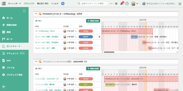 具体的な例でお話ししましょう。筆者の仕事では「毎月必ず掲載する連載記事」がたくさんあります(この記事もそのひとつです)。進行漏れを防ぐために、毎月、すべての連載記事をBacklogの課題として登録しています。登録さえできれば、複数の連載記事の進行スケジュールがガントチャートでまとめて確認できて、進行管理がかなり楽になります。