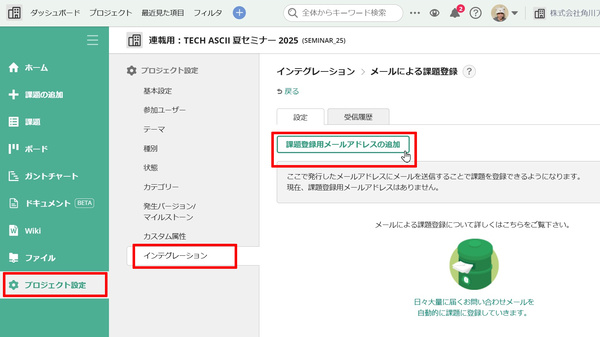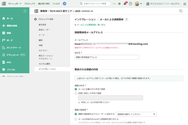この機能を使うためには、「プロジェクト設定」のページで設定を行う必要があります。設定をすれば、backlog.comドメインの専用メールアドレスが発行されます。ここに課題の内容を書いたメールを送れば、プロジェクトに課題が新規登録されるわけです。
