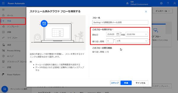 Power Automateのポータルサイト(https://make.powerautomate.com)にアクセスし、「作成」メニューからフローの作成を開始します。今回は、ワークフローを定期的に自動実行してくれる「スケジュール済みクラウドフロー」を選びます。「毎月20日」に翌月分の課題登録を自動実行させたいので、実行の「開始日」を次に来る20日の適当な時刻に、「繰り返し間隔」を1カ月と設定しました。