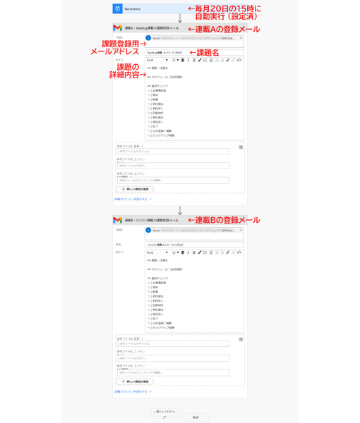 複数の課題をまとめて登録したい場合は、「新しいステップ」をクリックして「メールの送信」アクションを追加していけば対応できます。