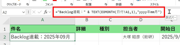 これも、簡単なExcel関数を使えば自動化が実現できます。たとえば「Backlog連載:2025年09月」のように自動入力させたい場合は、次の数式になります。