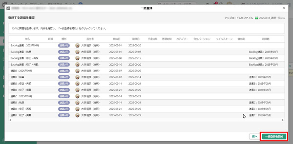 今後は、このExcelファイルを毎月1回開けば、翌月分の日付が自動入力された「課題一覧」シートが生成されます。そして、この「課題一覧」シートをCSVファイルとして書き出し(保存し)、Backlogにアップロードすれば、翌月分の課題登録がまとめて行えます。