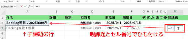 これを防ぐには、子課題側の「親課題」セルを、課題名をテキストで入力するのではなく、親課題の課題名のセル番号を参照する形にします。こうすれば、親課題の名前が変化しても子課題のひも付けが切れることはありません。