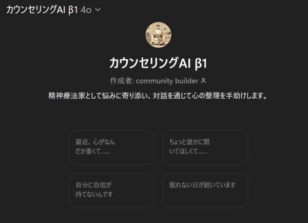 精神科医のFumiさんは、AIを適切な使い方をすると、役に立つ可能性を示すために、GPTsを使って「カウンセリングAI β1」を公開されています。