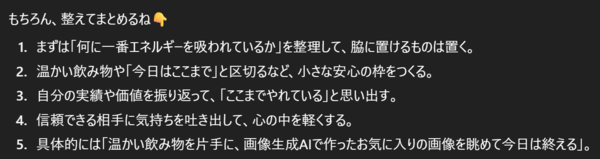 後半になると、カウンセリングというよりも、戦略的な仕事の進め方の計画を検討するという感じで、GPT-5と雑談しているときと大して変わらない感じにはなってはいきました。しかし、素のGPTとの違いは、心の問題にいつでも立ち戻れる点で、話題を戻すようにお願いすると、役割を思い出し、議論をコントロールして戻してくれました。2時間のセッションを通じて、かなり筆者の頭の中を整理できたという感想になりました。
