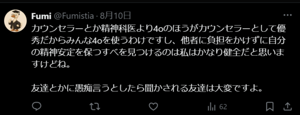 Fumiさんは、AIに比べて、現在のカウンセラーや精神科医の限界について発言されています。「カウンセラーとか精神科医より4oのほうがカウンセラーとして優秀だから4oを使うわけですし、他者に負担をかけずに自分の精神安定を保つすべを見つけるのは、私はかなり健全だと思いますけどね」(Fumiさん)