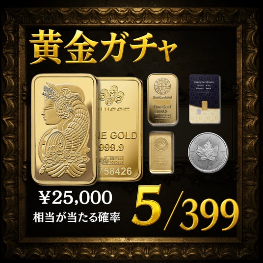 ラスイチ賞:ガチャの最後の1回を引いたお客様には、「2.5g 純金インゴット PAMP スイス製」が送られます。