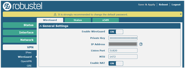 VPN → WireGuard → General Settings の Private Key に、ソラコムのコンソールからコピーしたクライアント側の Private Key を設定します。同様に IP Address に、ソラコムのコンソールからコピーしたクライアント側の IP Address を設定します。