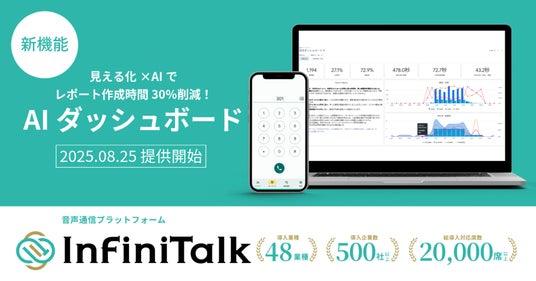 インパクトホールディングス株式会社の連結子会社で、コールセンターの受託、情報通信・コンテンツサポート事業をはじめとした BPO 事業を展開するジェイエムエス・ユナイテッド株式会社 (本社:東京都港区、代表取締役社長 倉本雄太、以下 「当社」 ) が提供する音声通信プラットフォーム 「InfiniTalk (インフィニトーク) 」 は、AIの分析力と直感的な可視化を融合し、コールセンター管理者の迅速かつ効果的な意思決定を支援する新機能 「AIダッシュボード」 を2025年8月25日より提供開始いたします。
