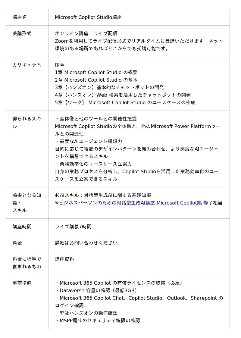 講師が伴走しながら、受講者は実践的なハンズオンとワークを通じて、Copilot Studioを活用して業務を自動化のユースケースを立案・チャットボットを構築できるスキルを習得します。