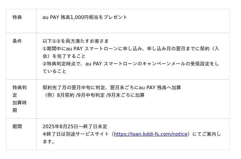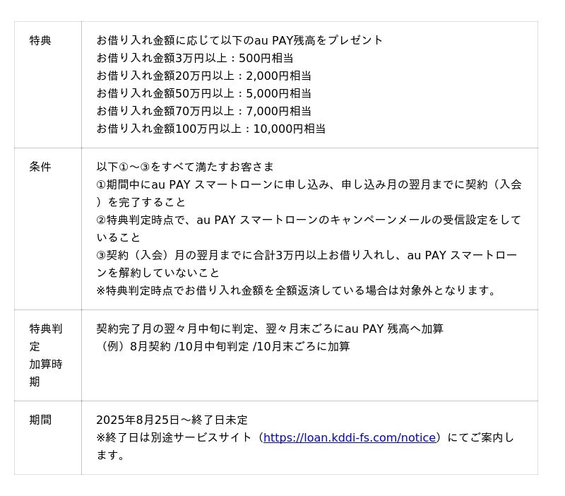 2025年7月から提供している、1万円以上のお借り入れで毎月合計1万名に抽選で最大2,000円相当のau PAY 残高が当たる特典(https://www.kddi-fs.com/contents/co-news/0130/index_files/resources/pdf_20250701_2_news.pdf)とあわせて、おトクにau PAY 残高がもらえます。