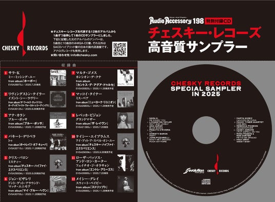 1986年にデヴィッド・チェスキーとノーマン・チェスキーの兄弟によって設立されたチェスキー・レコーズは、高音質録音に特化したアメリカのレコードレーベルとしてオーディオファンの間でも絶大な評価を得ています。今号の付録であるサンプラーCDには、ヴォーカリストを中心にカントリーからソウル、ジャズ、ボサノヴァなど幅広いジャンルの12の楽曲を収録。そしてこのページで、オーディオ評論家の小原由夫氏がチェスキー・レコーズの魅力をたっぷりとレポートしています。チェスキー・レコーズの数々の名盤を手掛けたエンジニア/プロデューサーのニコラス・ブラウト氏へのインタビュー、